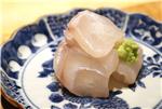 熟成させた長崎産のクエの引き造り。しっとりとした舌触りとともに、じんわりと甘みと旨みが広がる逸品。わさび醤油やすだち岩塩でいただくと、その繊細さが際立つ。