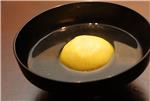 福岡産「とよみつひめ」を昆布とともに酒蒸しし、葛をまとわせてお椀に。かつて朝茶事などで供されたという古き佳き一品。月に見立てた極限にシンプルな表現の中に繊細で複雑な味わいが詰まっている。