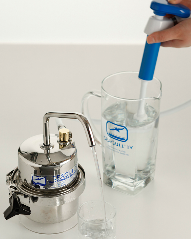 シーガルフォーには、地震・災害で水道からの給水が止まったときに、川、池、貯水タンク、バケツなどから、手動で水を汲み上げ、シーガルフォーのカートリッジに通して浄水を作るための道具が用意されています。