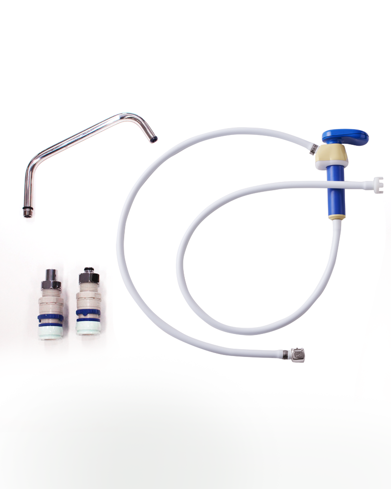 カウンタートップタイプへ切り替えるための「アダプター」と「ノズル」、そして「ハンドポンプ」の3点がセットになった「BS用災害キット」。